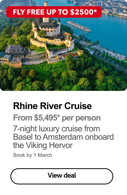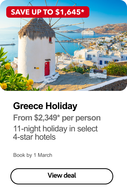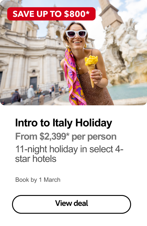 *Terms & conditions apply visit www.flightcentre.com.au/ads for full conditions. Prices & taxes are correct as at 8 Jan 26 & are subject to change without notice. Prices quoted are on sale until 1 Mar 26 unless otherwise stated or sold out prior. Prices quoted are per person, twin share (unless otherwise stated). Advertised saving and/or bonus value based on twin-share/per family of 4. Payments made by credit card will incur a surcharge. Advertised prices shown are for payments made by cash in store only. Airfare not included unless otherwise stated. Flight Centre Travel Group Limited (ABN 25 003 377 188) trading as Flight Centre. ATIA Accreditation No. A10412.