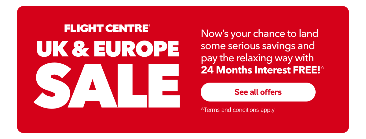 ^For approved new humm90 Mastercard Credit card applicants and existing humm90 Mastercard credit card holders only. Offer is available 19 January 25 to 1 March 25 on travel bookings over $800 purchased in-store using the 24 months Interest Free option on the humm90 Mastercard credit card only. Fees and charges apply, including a $9.95 monthly fee that commences on account opening. To qualify for the Interest Free Period on Long Term Interest Free offers, customer must pay a monthly minimum payment of 3% of the balance owing or $30.00 (whichever is greater) and remain up to date with other applicable fees and charges. The humm90 Expired Promotional Rate shall apply to any balance owing at the expiry of the LTIF period. Late payment fees and other fees, terms and conditions apply. Please refer to www.humm90.com/au/important-information/ before deciding to apply. Credit is provided by Humm Cards Pty Ltd ABN 31 099 651 877, Australian Credit License number 247415. For further terms and conditions refer to http://www.flightcentre.com.au/p/interest-free. Flight Centre Travel Group Limited (ABN 25 003 377 188) trading as Flight Centre. ATAS Accreditation No. A10412. DD-8026